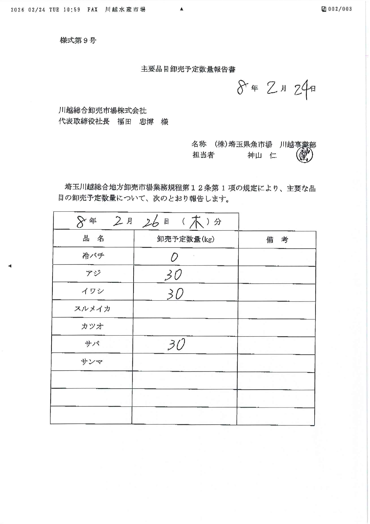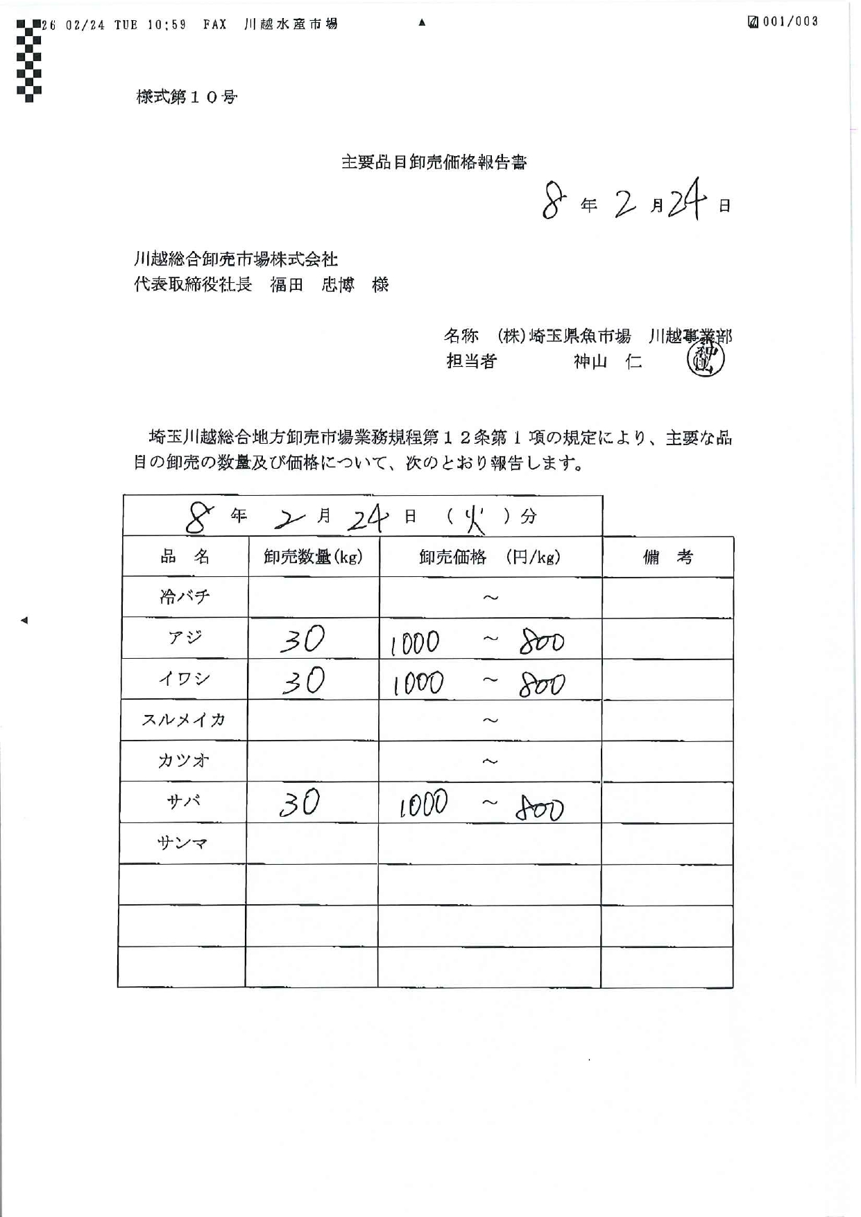 卸売市場法施行規則第22条により、次の通り公表致します。