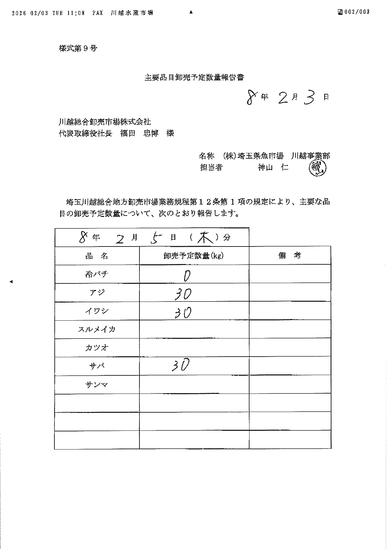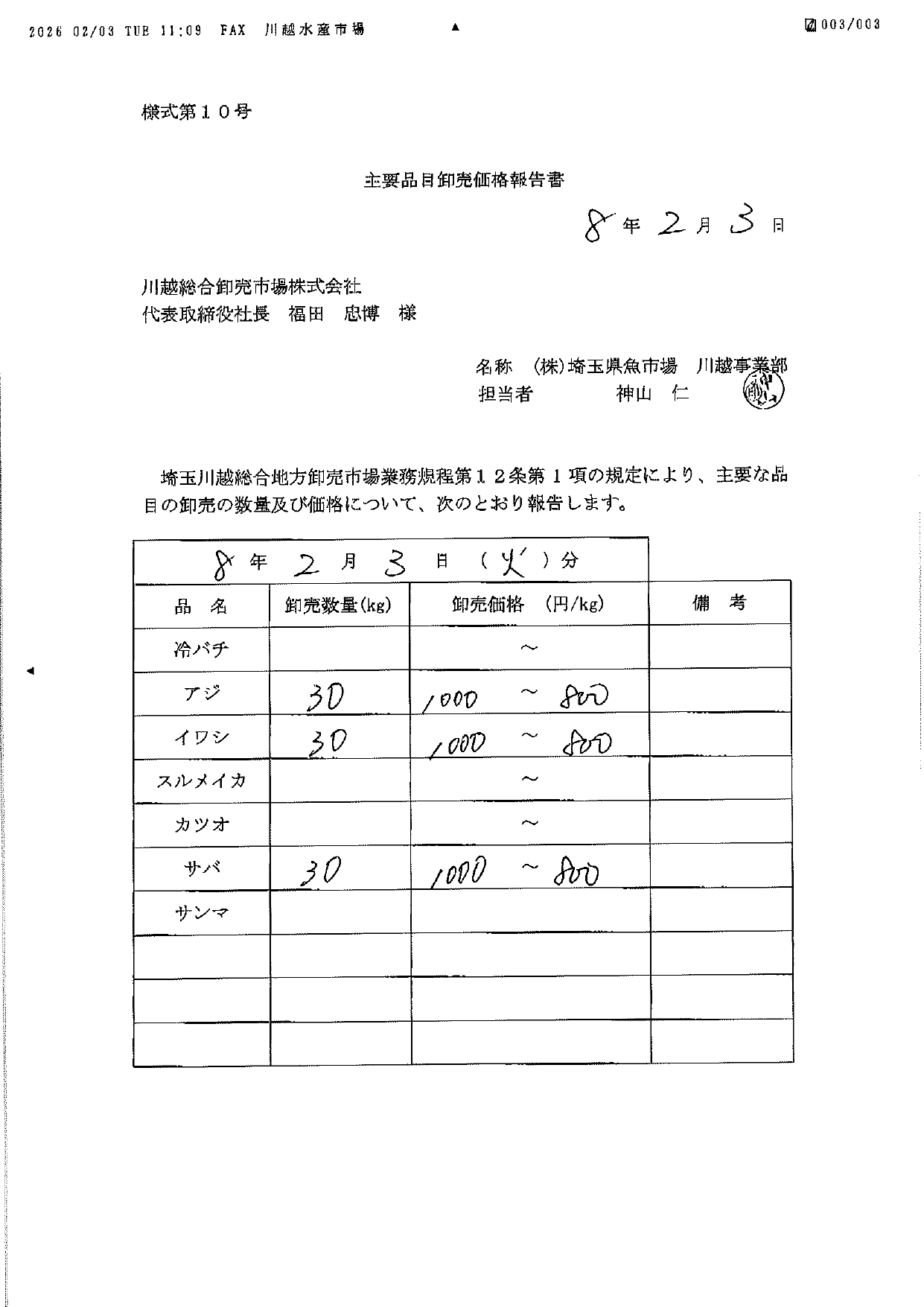 卸売市場法施行規則第22条により、次の通り公表致します。